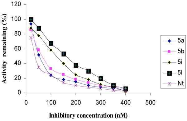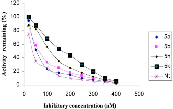 The inhibitory activities of the novel synthesized compounds against AChE were studied using the method of Ellman et al. [24]. Determination of the rate of hydrolysis of Acetylthiocholine (ATCh) in the presence of inhibitors against different sources such as electric eel AChE, human serum AChE and rat brain homogenate AChE is shown in Figs. (1-3), respectively. The comparative inhibitory activities of 5a-k are tabulated in Table 2.