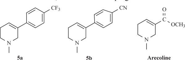 Alzheimer's disease (AD) is an irreversible, progressive neurodegenerative disorder that occurs gradually and results in memory loss, unusual behavior, personality changes and a decline in thinking abilities [1]. Taking into account the increase in life expectancy, the fact that the incidence of AD increases with advancing age and the devastating effects of this illness, nowadays AD represents a major public health problem and will presumably be the most important pathology of the 21st century in the developed countries. Efforts have been made in the last two decades in order to determine the etiopathogenesis of AD and to carry out its early diagnosis and therapeutic control [2, 3]. Survival disease is variable in patients with AD and they usually die of infections, with death occurring approximately 10 years after the onset of symptoms. Thus, AD is the third largest cause of death in the western world after cardiovascular diseases and cancer. As a consequence, potentiation of central cholinergic action has become an effective approach for the palliative treatment of mild to moderate cases of AD [4]. Several therapeutic strategies have been explored to enhance cholinergic neurotransmission in order to alleviate some of the symptoms of AD. These include the use of Acetylcholinesterase inhibitors, the administration of acetylcholine precursors, the investigation of acetylcholine releasers and direct acetylcholine receptor agonists [5]. Among these strategies, inhibition of AChE has proven to be the most successful means to balance the cholinergic deficit and to stabilize the symptoms [6]. Two main strategies can be adapted in the treatment of AD, alleviating the cognitive deficits and slowing down degenerative process. Current therapy comes under the first approach [7]. To date, the cholinesterase inhibitors have been shown to improve some aspects of cognitive performance, however, efficacy has been poor and side effects are problematic [8-10]. A variety of compounds particularly cholinesterase inhibitors, were used in an attempt to increase cholinergic activity [11, 12]. Physo-stigmine (1,2,3,3a,8,8a-hexahydro-1, 3a,8-trimethyl-,methyl-carbamate(ester),(3aS,8aR)-pyrrolo(2,3- b)indol-5-ol), was one of the earlier acetylcholinesterase (AChE) inhibitors studied, produced modest improvements in cognition, but its use was limited because of frequent dosing regimen and severe adverse reactions [13-15]. The first available treatment for AD was THA (1,2,3,4-tetrahydro-9-aminoacridine), which demonstrated moderate but significant efficacy [16]. Arecoline (Methyl 1,2,5,6-tetra-hydro-1-methylpyridine-3-carboxylate) is a naturally occurring alkaloid with cholinergic properties as a tertiary amine. This muscarinic agonist has strong lipophilic properties and can easily cross the blood-brain barrier after systemic administration [17]. Many experimental studies in animals [18, 19] as well as few clinical studies in demented patients and normal volunteers [20, 21] have demonstrated the ability of arecoline to prevent or to reduce memory deficit. Due to rapid in vivo hydrolysis of the ester functional group, arecoline has an extremely short half life and negligible activity after oral administration [22, 23]. Based on the knowledge acquired from the basic studies of several known arecoline derivatives about the structural requirements for potent AChE inhibitors, a series of N-methyl tetrahydropyridine-3 derivatives were been synthesized and screened for their efficacy as AChE inhibitors.