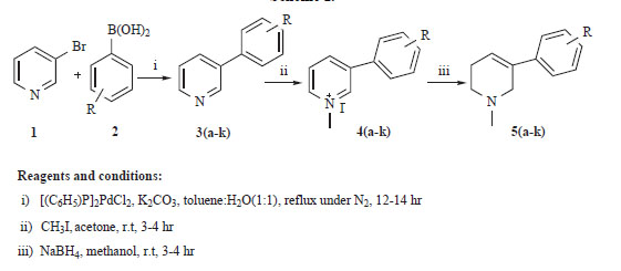 The preparation of novel 3-aryl-N-methyl-1,2,5,6-tetrahydropyridine derivatives 5a-k is summarized in Scheme 1, via Suzuki coupling by using commercially available 3-bromopyridine as starting material. The synthesis involves three steps; the first step involves the Suzuki coupling, where mixture of 3-bromopyridine and substituted aryl boronic acids in toluene: H2O (1: 1) was refluxed overnight using bis(triphenylphosphine) palladium (II) dichloride as a catalyst in the presence of the mild base K2CO3. The presence of aromatic proton peaks at 6.9-7.8 ppm in the 1H NMR spectra confirms the formation 3-aryl pyridines 3a-k. The second step is the N-methylation using Methyl iodide in acetone as a solvent at room temperature and the formation of the derivatives 4a-k was confirmed by the presence of singlet methyl peak at 2.51 ppm. The third step is the reduction of the N-substituted pyridine 5a-k using NaBH4 in Methanol, the presence of a triplet of an olefinic proton at 6.2-6.35 ppm and also the multiplets for aliphatic proton at 2.4-3.3 ppm in the 1H NMR spectra, confirming the partial reduction of the pyridine ring. All the synthesized compounds 5a-k obtained in good yield ranged from 77-92% with high purity. The chemical structures, physical data and purity of the derivatives are shown in Table 1.