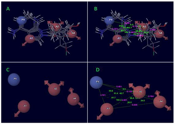 pharmacophore site was used to make the common pharmacophore hypothesis of active ligands via a tree-based partitioning. However, the atoms of all ligands were assigned by pharmacophore H-bond acceptor (A), features aromatic ring (R), Hydrophobic group (H), and negative charge group (N), H-bond donor (D), positively charge group (P) [11].