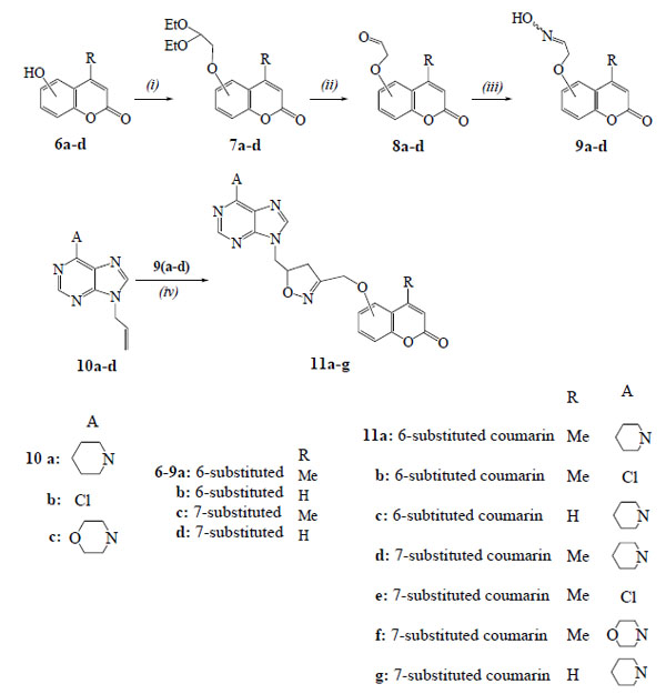 Another way is presented in Scheme (2) for the synthesis of the hybrid compounds 11a-g using the 1,3-dipolar cycloaddition reactions of nitrile oxides, formed in situ from the (coumarinyloxy)acetaldehyde oximes 9a-d, with the 9-allylpurines 10a-d. The oximes 9a-d (84-88% yields) were prepared for first time from the corresponding substituted acetaldehydes 8a-d [21, 22] by treatment with NH2OH.HCl in ethanol-water in the presence of anhydrous CH3COONa at 80° C for 1.5 h. The acetaldehydes 8a-d were in turn prepared in 87-94% yields by refluxing a hydrochloric acid solution of the corresponding acetals 7a-d for 1 h. The acetals 7a-d were synthesized from the hydroxycoumarins 6a-d after heating with 2-bromo-1,1-diethoxyethane and K2CO3 in DMF at 90°C for 24 h.