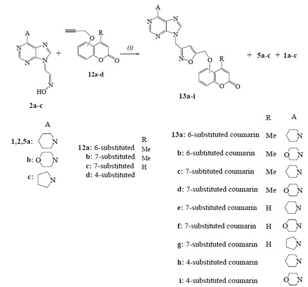 2.1.4. General procedure. 1,3-Dipolar cycloaddition reactions of (purin-9-yl)acetaldehyde oximes with propargyloxycoumarins. Synthesis of 4-methyl-6-({3-[(6-piperidin-1-yl-9H-purin-9-yl)methyl]isoxazol-5-yl}methoxy)-2H-chromen-2-one (13a)