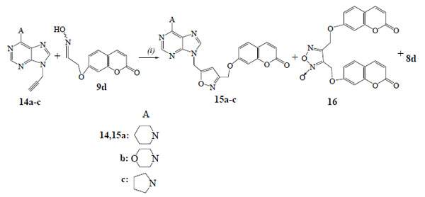 2.1.5. General procedure. 1,3-Dipolar cycloaddition reactions of [(2-oxo-2H-chromen-7-yl)oxy]acetaldehyde oxime (9d) with propargylpurines. Synthesis of 7-({5-[(6-piperidin-1-yl-9H-purin-9-yl)methyl]isoxazol-3-yl}methoxy)-2H-chromen-2-one (15a)