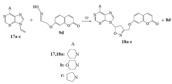 The 9-vinylpurine 17a [28] reacted with the oxime 9d to give the isoxazoline 18a (66%) (Scheme 5). No furoxan 16 was detected in the reaction mixture. The isoxazoline 18a has the same regiochemistry, like the others, as the protons of OCH2 group [5.06 ppm (d, 1H)/5.12 ppm (d, 1H)] in HMBC experiments are correlated with the carbon of 4-CH2 (isoxazoline) (46.9 ppm in 13C-NMR) and not with the 5-CH (isoxazoline) (84.4 ppm). The reactions of purines 17b,c gave the isoxazolines 18b (62%) and 18c (60%) respectively, along with the aldehyde 8d (15%).