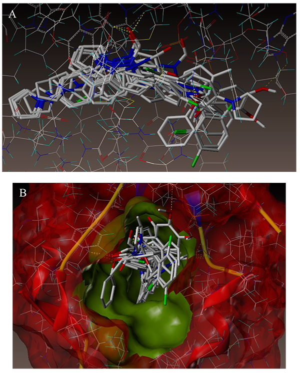 Molecular docking was performed to elucidate the type of binding of the compounds to afford uncomplicated information for further structural optimization. Surflex-Dock that adopted an experimental scoring function and a patented searching engine [32, 33] was employed in molecular docking studies. The crystal structure of M. tuberculosis enoyl reductase (InhA) complexed with 1-cyclohexyl-N-(3,5-dichlorophenyl)-5-oxopyrrolidine-3-carboxamide (PDB ID 4TZK, 1.62 Å X-ray resolution) was downloaded from the Brookhaven Protein Database (PDB http://www.rcsb.org/pdb). During the preparation of protein for docking study, ligands and water molecules present in the crystal structure were removed (except co-factor NAD+), then the enzyme 4TZK was assigned with polar hydrogens and united atom Amber7 FF99. Then, ligand-based mode was used to produce the “protomol”, keeping the threshold and bloat parameters at their default values of 0.50 and 0 Å all the inhibitors were docked within the prepared protein.