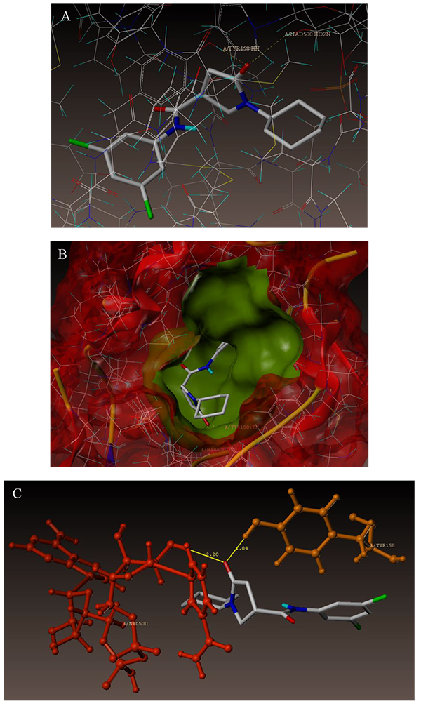 Molecular docking was performed to understand drug-receptor interactions. The results have shown that the compounds are mainly bound to the substrate binding site of InhA and the scoring function for most of the compounds is similar to that of the reference inhibitor. The anti-TB activity of these compounds was fully supported by in silico molecular docking calculations. The synthesized compounds were found to be useful as the lead compounds for further developing InhA inhibitors. Our future goal is to identify the mechanism of action and explore the pyrrole analogues, which might serve as a new template for further investigations amid selective and less toxic anti-TB agents to merit the cost effective and reduced treatment time. More studies are underway to improve their efficiency against InhA and M. tuberculosis.