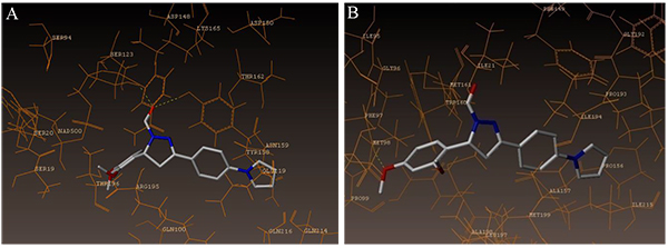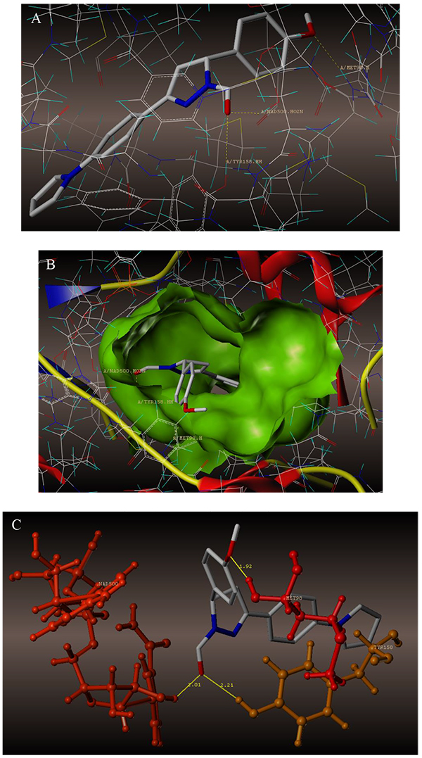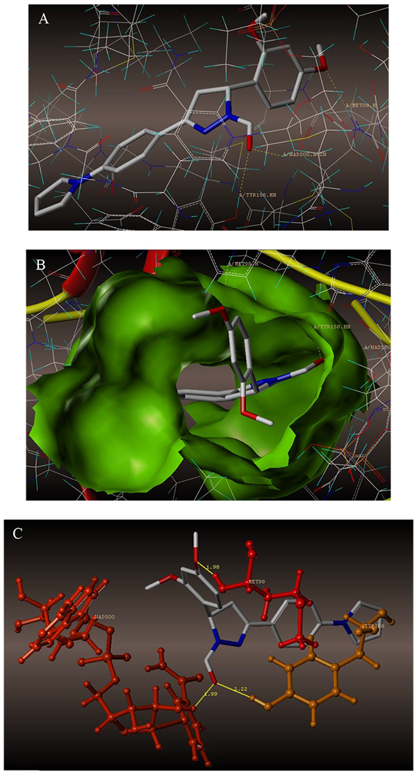 Interaction mode of the ligand present in the crystal structure was used as a standard docked model against 4TZK PDB. The maximum of 20 numbers of maximum orientations per ligand was set with no constraints to perform molecular docking. Docking complex was believed to show the ligand-receptor interactions, which was selected based on three criteria: (i) docking score of the orientation possessed the highest docking score, (ii) orientation of aromatic rings of the ligand into the active site in a similar manner with the co-crystallized ligand orientations, and (iii) preservation of H-bonding interactions with Tyr158 and Co-factor NAD+. For comparative study of the designed molecules, the following parameters were estimated using the C-Score module of the Sybyl-X 2.0, D_score [34], PMF_score [35], G_score [36] and Chem_score [37].