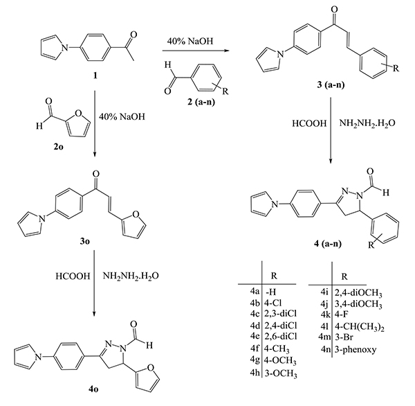 Synthesis of all the compounds was carried out as depicted in Scheme (1). The Paal-Knorr synthesis involved the reaction of diketone like 2,5-dimethoxy tetrahydrofuran with amine, which is among the most conventional method for the synthesis of heterocyclic pyrrole ring. Hence, (4-pyrrol-1-yl)acetophenone (1) was obtained by forming pyrrole ring using the amino group present at the para- position of aromatic ring of 4-amino acetophenone in the presence of dried glacial acetic acid. The required key intermediates viz., chalcones (3a-o) were synthesized using Claisen-Schmidt condensation reaction between (4-pyrrol-1-yl)acetophenone (1) and substituted aldehydes (2a-o) in the presence of 40% alcoholic sodium hydroxide. Thus, synthesized chalcones (3a-o) were then cyclized to pyrazolyl carbaldehyde (4a-o) in a solvent free atmosphere by treating with hydrazine hydrate and formic acid.