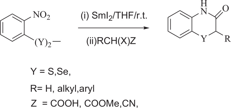 W. Zhang et al. have reported the synthesis of medicinally valuable benzothiazine (1, 4-benzothiazines) by the reaction of bis(o-nitrophenyl) disulphide with Kagan’s reagent [58] (Schemes 12).
