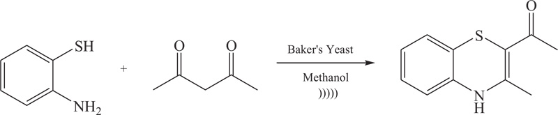 Pratap et al. have designed a green, economical yet efficient synthesis of most biodynamical thiazine form:1,4-benzothiazines involving oxidative cycloaddition of 2-aminobenzothiol and 1,3-dicarbonyls in the presence of a cheaper biocatalyst baker’s yeast. Ultrasonication is also used to expedite the condensation process as it is responsible for the interference of the yeast cells for the fast discharge of the enzymes [69] (Schemes 15).