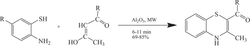 Paul et al. reported that aminobenzothiols and β-ketoester /β-diketones(using basic alumina as support under microwave irradiation) reacted with each other and produced medicinally important benzothiazines. The yield so obtained was found to vary in accordance with the amount of support taken and it was observed that maximum yields were obtained with 5-6 g of support versus 2mmol of the reagents [70] (Schemes 16).