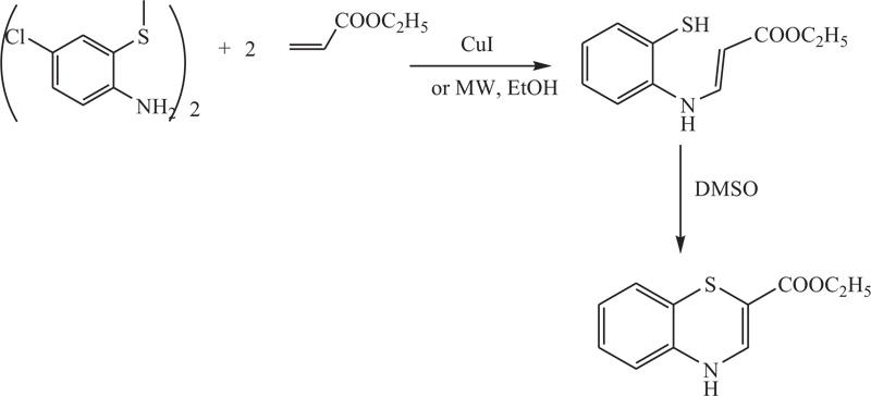 Lizhi Fu et al. described a convenient method especially required in the synthesis of benzothiazines and their derivatives, which involves coupling between 2-amino-5-chlorophenyl disulphide and ethyl acetylenecarboxylate. The process is catalyzed using CuI or can be promoted via microwave irradiation, which expedites it and reduces the generation of by-products. Finally, the cyclization of the obtained compound with DMSO, followed by the oxidation using m-CPBA, afforded 4H-1,4-benzothiazines [71] (Schemes 17).