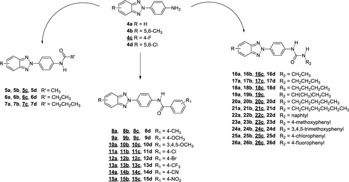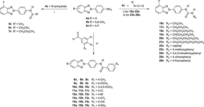 As reported in Scheme. (2), condensation of 4c with the appropriate anhydride (acetic, propionic or butyric anhydride), afforded the corresponding amides (5-7) in 26-31% of yield. While the condensation of 4c, in N,N-dimethylacetamide or toluene, with either required benzoyl chloride or isocyanate derivatives, afforded the N-(4-(4-fluoro-2H-benzo[d] [1-3]triazol-2-yl)phenyl)benzamide derivatives (8c-15c) in 9-79% of yield and 3-(4-(4-fluoro-2H-benzo[d] [1-3]triazol-2-yl)phenyl)urea derivatives (16c-26c) in 23-86% of yield, respectively. Condensation of compounds 4a,b with benzoyl chloride leads to the formation of derivatives 8a,b-15a,b.