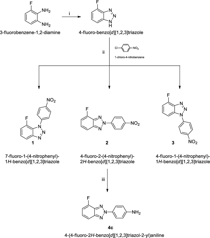 2.7.1. General procedure for the preparation of 7-fluoro-1-(4-nitrophenyl)-1H-benzo[d] [1-3]triazole (1), 4-fluoro-2-(4-nitrophenyl)-2H-benzo[d] [1-3]triazole (2) and 4-fluoro-1-(4-nitrophenyl)-1H-benzo[d] [1-3]triazole (3).
