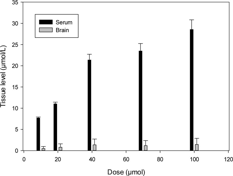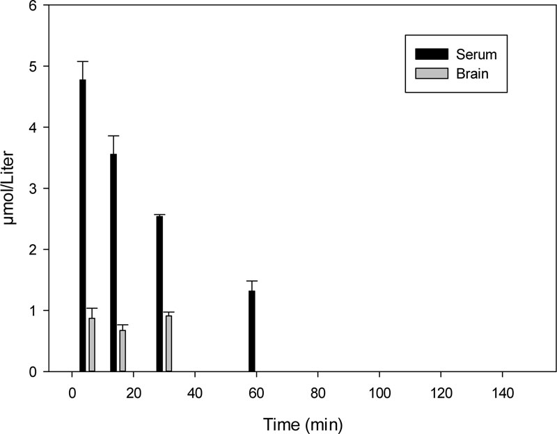 Rats (male, Wistar, 180-199 gram) were purchased from Toxicoop (Budapest, Hungary). Following a 24 h acclimatization period, rats were intramus- cularly injected with the freshly prepared aqueous solution of K-347. The solution was applied in one of the hindlimbs of rats in a volume of 0.2 mL. Rats were sacrificed 5, 15, 30, 60 and 120 min following administration. In the dose-dependence studies, 10, 20, 40, 70, 100 µmol doses of K347 were i.m. injected, and the animals were sacrificed at 30 min following the treatment. One of the 10 animals got lost after 10 minutes following its treatment with 70 µmol of K-347. Rats were anaesthetized and exsanguinated in the campus and serum was gained by centrifugation (1600 g, 15 min, 4 0C, Janetzky-K70, Berlin, Germany). CSF was collected by cisternal puncture through the foramen occipital magnum. All the other tissue samples were isolated immediately and kept at -80 ºC, not longer than 14 days. On the day of the analysis, the aliquots of the samples were homogenized in 0.3 M of perchloric acid (PCA) by an Ultra Turrax T25 Janke & Kunkel homogenizer (IKA Labortechnik, Staufen, Germany) at 20,000 rpm/min for 30 s at room temperature. Serum samples were homogenized with a 9-fold excess of PCA; 4-fold excess of PCA was added to all the other samples. The homogenates were centrifuged in an Eppendorf centrifuge (A. Hettich, Tuttlingen, Germany) at 14,000 rpm for 20 min at 4°C. The supernatants were directly used for HPLC.