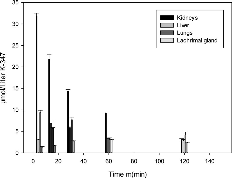 K-347 gets eliminated from the body of rats through the kidneys, lungs, livers and lacrimal glands. The essential organs of elimination are the kidneys, while the lungs also play a major role, as the level of K-347 in kidneys is continuously higher than that in the liver and the lacrimal glands (Fig. 2).