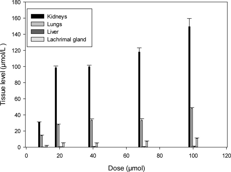 The excretion of K-347 takes place through the kidneys, lungs, liver and lacrimal glands. Their dose-dependent K-347 levels are shown in Fig. (4).