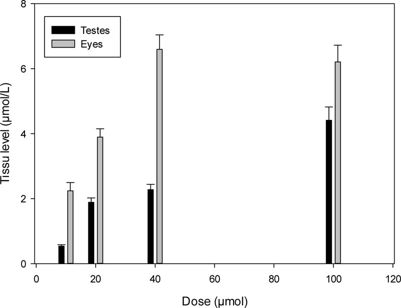 The levels of K-347 in the testes and eyes were elevated with increasing doses as shown in Fig. (5).
