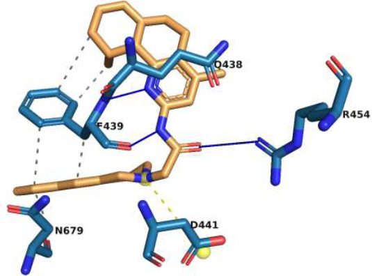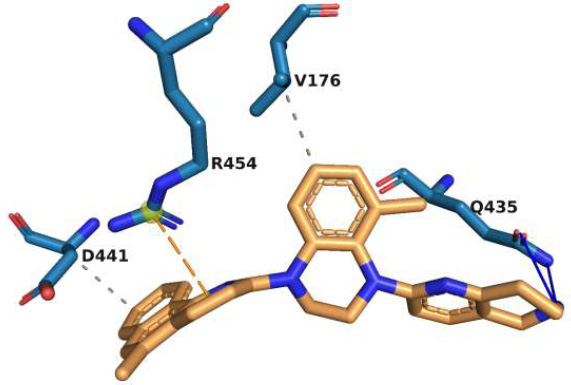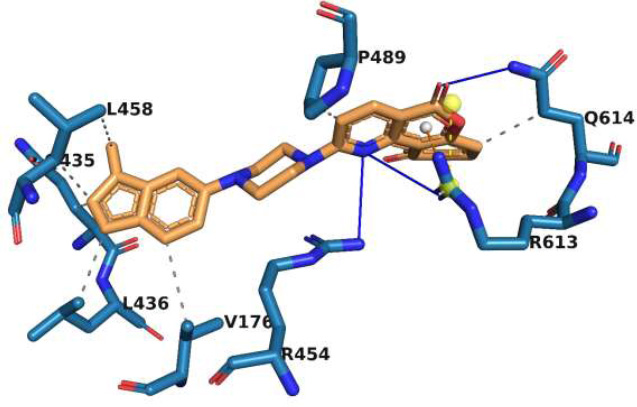 Interaction of molecule M1 with the active site residues of rpoB protein. The blue lines represent hydrogen bonds, the yellow dashed lines represent salt bridges, the orange dashed lines represent π-cation interactions, and the grey dashed lines represent hydrophobic interactions.