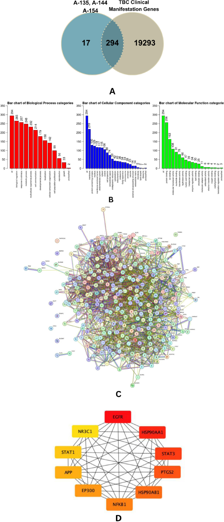 Based on predictions from SwissTargetPrediction, the combination of A-135, A-144, and A-154 was associated with 300 potential molecular targets (Supplementary Table 1). In parallel, the SuperPred Target Prediction platform identified 370 receptor-level targets for the same compound set (Supplementary Tables 2 and 3). GeneCards and NCBI further contributed a comprehensive list of 19,587 genes associated with key clinical manifestations of TBB, including malnutrition, anemia, inflammatory responses triggered by Mtb, and multidrug-resistant TB (MDR-TB) (Supplementary Table 4). Integrative analysis using a Venn diagram revealed 294 overlapping genes, referred to as Tuberculosis and Halogenated-Benzylidene Target Genes (THTGTs), which were selected for subsequent downstream functional and network analyses (Fig. 3A-3D).