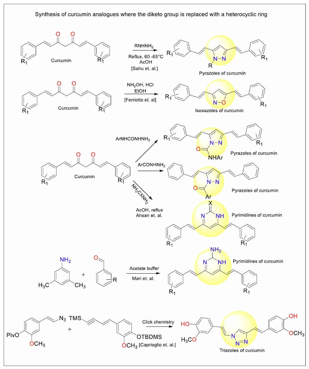 Figure 13 illustrates the synthesis of curcumin analogues where the central diketo group of curcumin is replaced with various heterocyclic rings, such as pyrazoles, isoxazoles, pyrimidines, and triazoles. These transformations generally involve cyclisation reactions facilitated by reagents such as hydrazines, hydroxylamine, or azides, under reflux or buffered conditions.