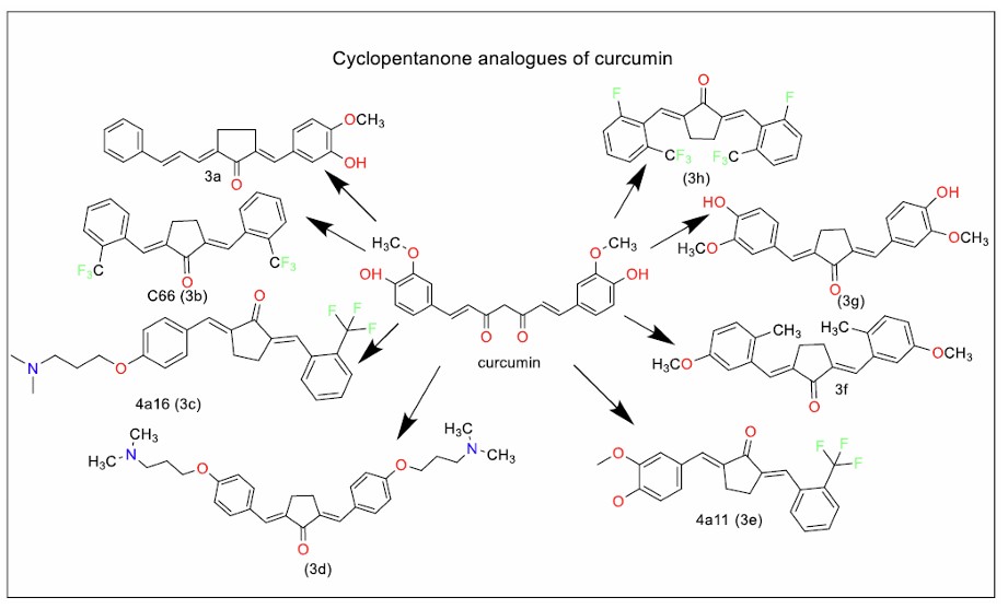 To address the instability associated with curcumin’s β-diketo chain, researchers have explored monocarbonyl analogues, which replace the β-diketo group with a more stable heterocyclic moiety. These compounds have been discussed here as piperidone analogues (Fig. 1, series 1a-1h), straight chain analogues (Fig. 2, series 2a-2j), cyclopentanone analogues (Fig. 3, series 3a-3h), and cyclohexanone analogues (Fig. 4, Series 5a – 5e)).