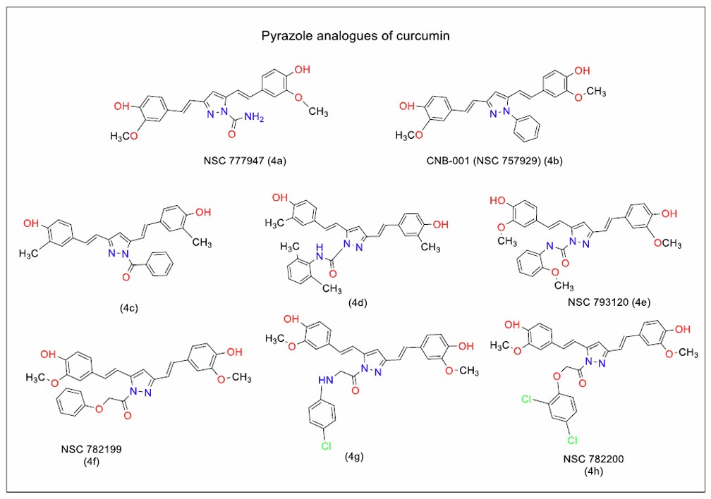 Mohamed et al. [90] evaluated three pyrazole analogues of curcumin against cancer cells and confirmed their therapeutic potential for targeting epidermal growth factor receptor (EGFR). The analogue featuring 1-[[4-chlorophenyl] amino] propane-2-one on the pyrazole ring (Fig. 5, 4g) emerged as a potential candidate for further development. However, Ahsan et al. [91] identified the non-specific activity of these analogues, suggesting the need for additional modifications to improve selectivity against cancer cells.