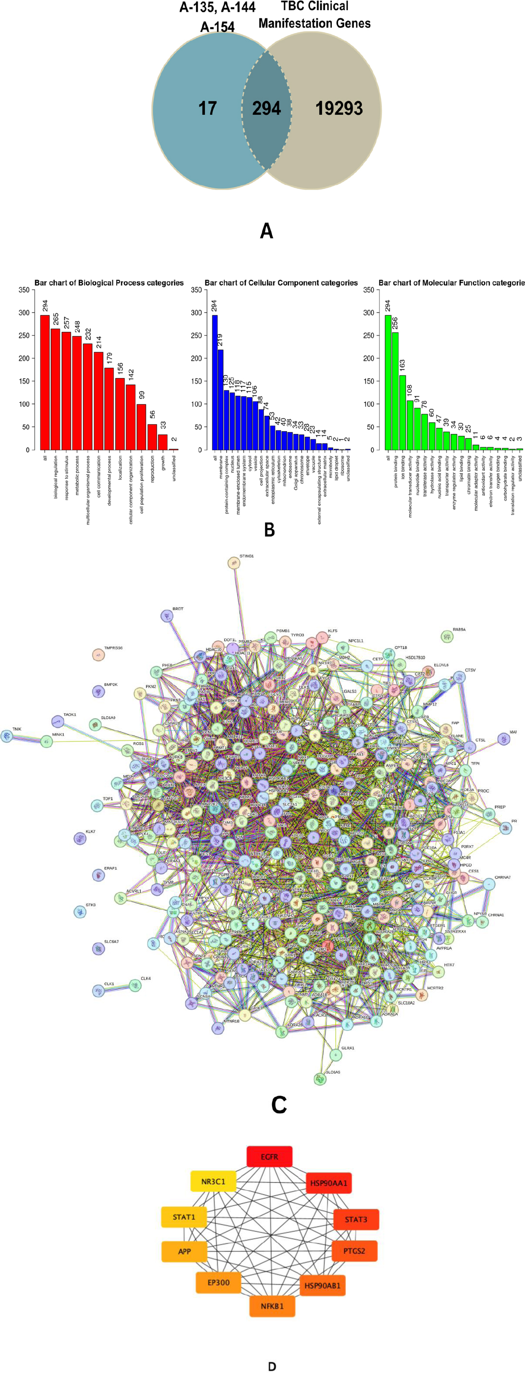 Based on predictions from SwissTargetPrediction, the combination of A-135, A-144, and A-154 was associated with 300 potential molecular targets (Supplementary Table 1). In parallel, the SuperPred Target Prediction platform identified 370 receptor-level targets for the same compound set (Supplementary Tables 2 and 3). GeneCards and NCBI provided a detailed compilation of 19,587 genes linked to significant clinical features of TBB, encompassing malnutrition, anemia, inflammatory reactions induced by Mtb, and multidrug-resistant TB (MDR-TB) (Supplementary Table 4). An integrative analysis employing a Venn diagram identified 294 shared genes, designated as Tuberculosis and Halogenated-Benzylidene Target Genes (THTGTs), which were then chosen for subsequent functional and network analyses (Fig. 3A-D).