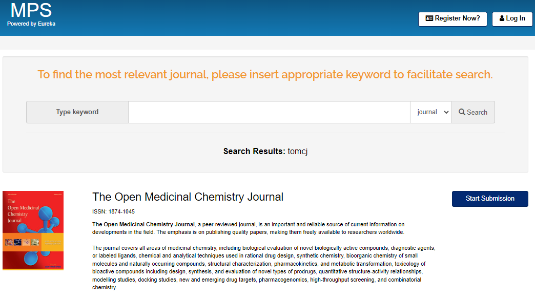 MPS is a user-friendly system that can be conveniently operated. The system allows rapid and easy submission of original and revised manuscripts and indicates their status throughout the submission process. Authors accessing the system for the first time will be required to Register themselves online at https://bentham.manuscriptpoint.com/index.php/Login/show_login and create an MPS account to submit a paper to a particular journal from the available list in the registration form.